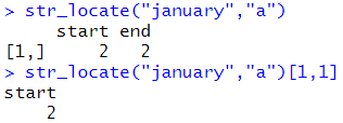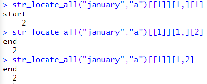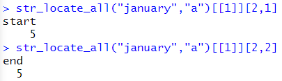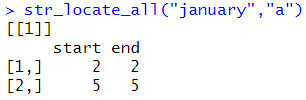 str_locate_all("january","a")[[1]][1,][1] str_locate_all("january","a")[[1]][2,1] str_locate_all("january","a")[[1]][2,2] |