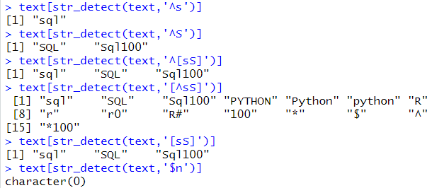 # 소문자 s로 시작되는 찾기 # 대문자 S로 시작되는 찾기 text[str_detect(text,'^S')] # 소문자,대문자 s로 시작되는 찾기 text[str_detect(text,'^[sS]')]
