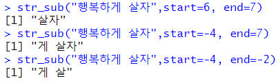 | str_sub("행복하게 살자",start=6, end=7) str_sub("행복하게 살자",start=-4, end=7) str_sub("행복하게 살자",start=-4, end=-2) |