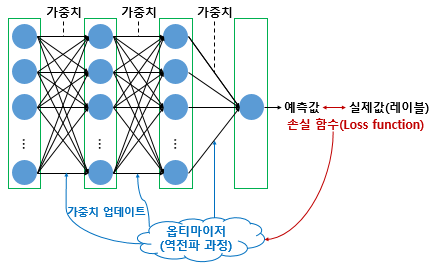 - 손실함수를 최소화하기 위하여 반복적으로 파라미터를 조정해나가는 방법