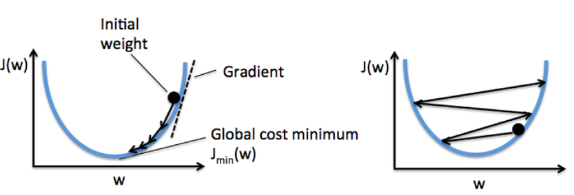 - 학습률(learning rate)이 너무 크면 학습시간이 짧아지나 전역 최솟값에서 멀어질 수 있음