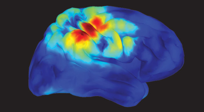 4) 위의 결과가 컴퓨터 화면에 컬러 이미지로 구현된다. 가장 활동적인 영역의 색깔이 밝게 빛난다.