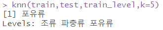 # kNN 사용하여 예측 library(class) knn(train,test,train_level,k=5) |