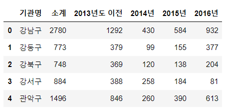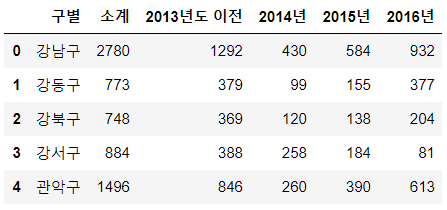 | CCTV_Seoul.sort_values(by='소계', ascending=False).head(5) |