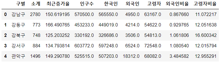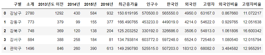 # 공통된 컬럼('구별')으로 CCTV데이터와 인구 현황 데이터 합치기