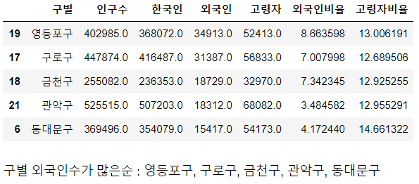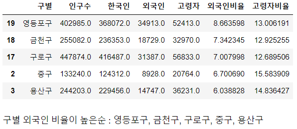 | pop_Seoul.sort_values(by='외국인비율', ascending=False).head(5) |