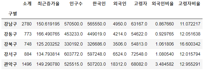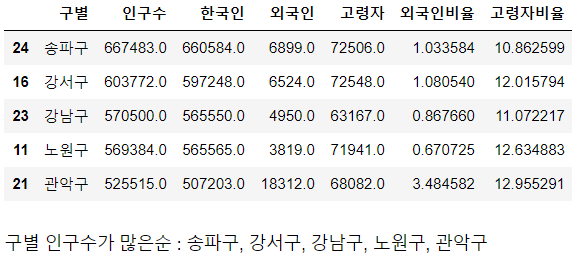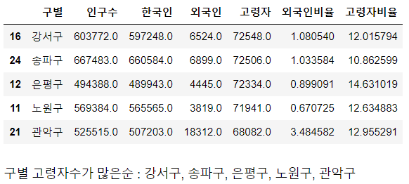 pop_Seoul.sort_values(by='외국인', ascending=False).head(5) |