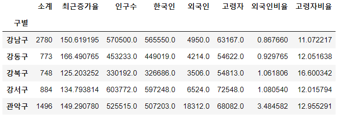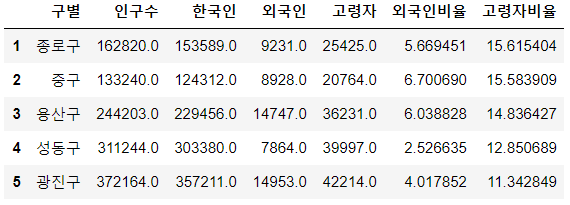 # 구별 외국인 비율과 고령자 비율 계산