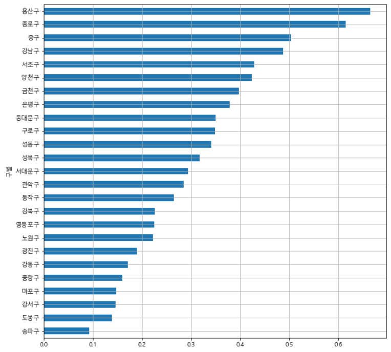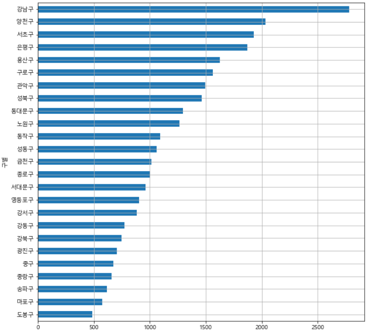 data_result['소계'].sort_values().plot(kind='barh', grid=True, figsize=(10,10)) |