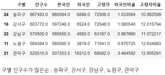 | pop_Seoul.sort_values(by='외국인', ascending=False).head(5) |