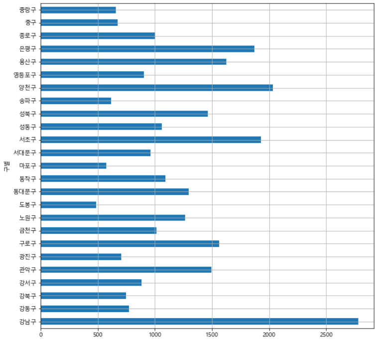 data_result['소계'].plot(kind='barh', grid=True, figsize=(10,10)) |