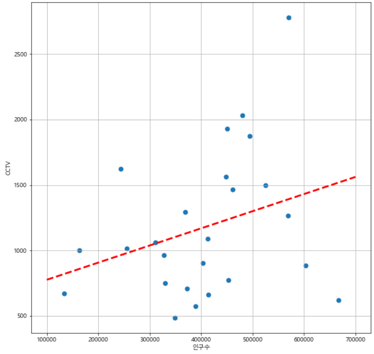 # 인구수와 CCTV의 관계를 대표하는 직선 그리기