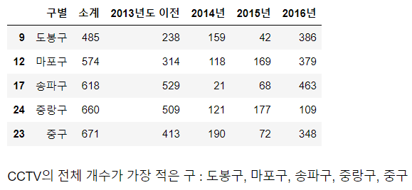 | CCTV_Seoul.sort_values(by='소계', ascending=True).head(5) |