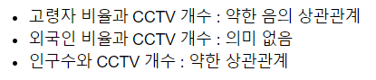 - 고령자비율, 외국인비율, 인구수 중에서 무슨 데이터와 CCTV를 비교할지 정하기