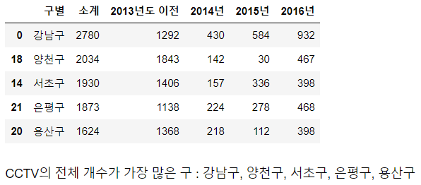 CCTV_Seoul['최근증가율'] = (CCTV_Seoul['2016년']+CCTV_Seoul['2015년']+CCTV_Seoul['2014년']) / CCTV_Seoul['2013년도 이전'] * 100 CCTV_Seoul.sort_values(by='최근증가율', ascending=False).head(5) |