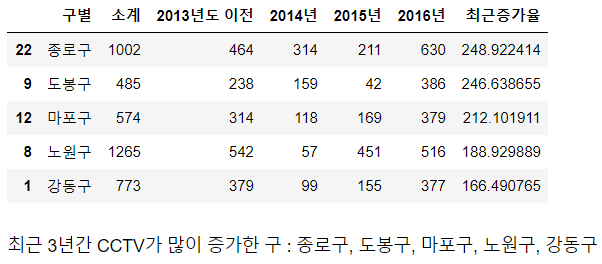 | CCTV_Seoul['최근증가율'] = (CCTV_Seoul['2016년']+CCTV_Seoul['2015년']+CCTV_Seoul['2014년']) / CCTV_Seoul['2013년도 이전'] * 100 CCTV_Seoul.sort_values(by='최근증가율', ascending=False).head(5) |