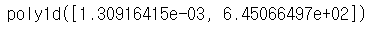 | fp1 = np.polyfit(data_result['인구수'], data_result['소계'], 1) fp1 |