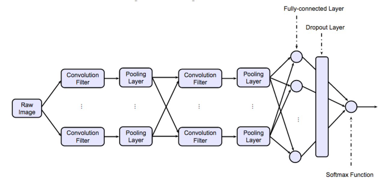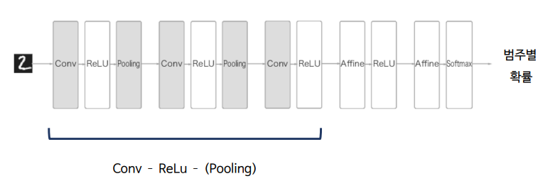 - 기존의 신경망(Artificial Neural Network) 구조에서 합성곱 계층(Conv), 풀링 계층(Pooling)이 추가된다.