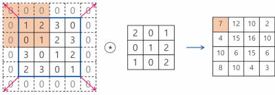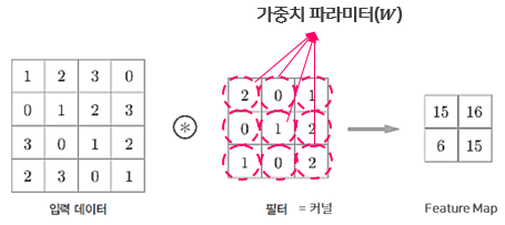 - 입력데이터와 필터간에 서로 대응하는 원소끼리 곱한 후 총합을 구하는것