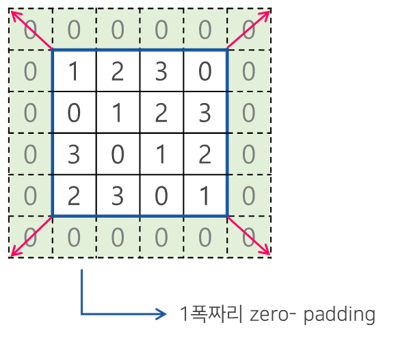 - 보통 패딩 값으로 0으로 채워 넣습니다.(zero padding)