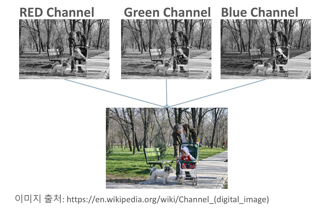 - 컬러 이미지는 각 픽셀을 RGB 3개의 실수(3개 채널)로 표현한 3차원 데이터이다.