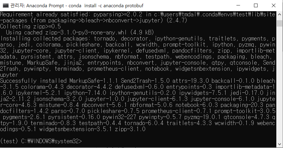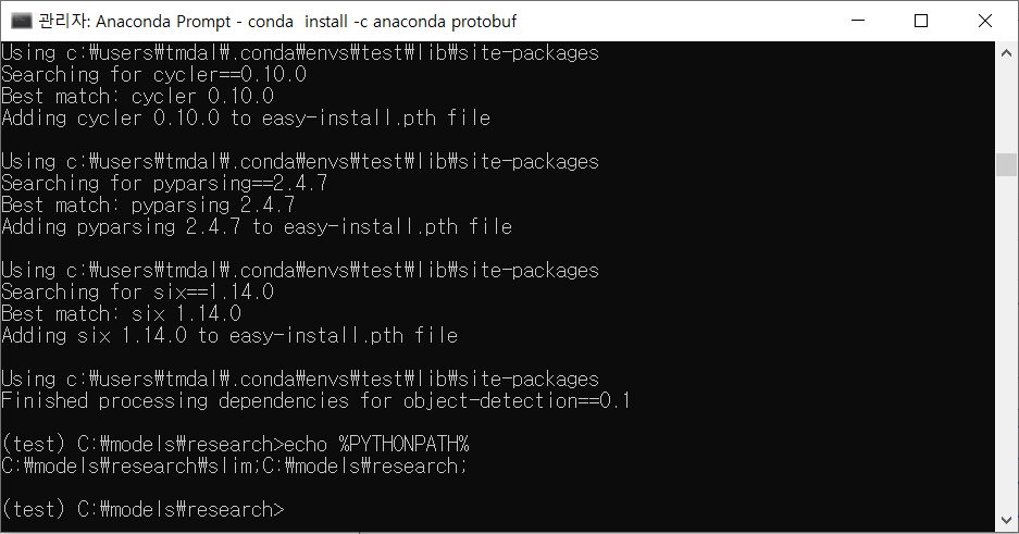 > conda install -c anaconda protobuf # Proceed ([y]/n)? 가 뜨면 y를 입력하고 Enter키를 누르면 됩니다. > pip install lxml > pip install matplotlib > pip install Cython > pip install pandas > pip install jupyter |