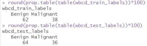 # 데이터별 라벨 분포 확인 table(wbcd$diagnosis) # 원본데이터 table(wbcd_train$diagnosis) # 훈련데이터 table(wbcd_test$diagnosis) # 테스트데이터