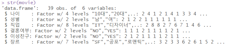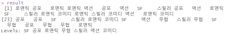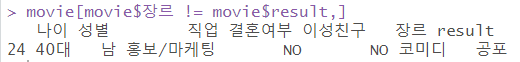 | # 실제값과 예측값이 다른 행 보기 movie$result <- result movie[movie$장르 != movie$result,] |