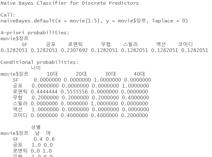 | # naiveBayes(학습데이터,라벨)로 학습 nm <- naiveBayes(movie[1:5],movie$장르,laplace=0) |