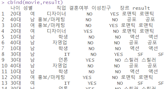 | # 예측한 값 컬럼으로 추가 cbind(movie,result) |