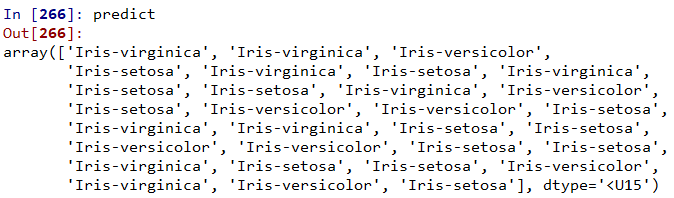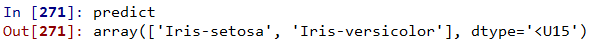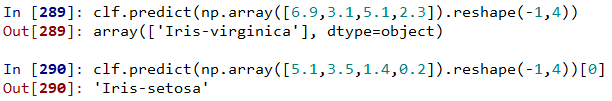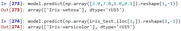 # 하나의 데이터만 넣고 싶을때(하나의 행, 모든 열) import numpy as np model.predict(np.array([2.0,7.0,1.0,0.1]).reshape(1,-1)) # reshape(1,4) # -1:모든것 model.predict(np.array(iris_test.iloc[1,]).reshape(1,-1)) |