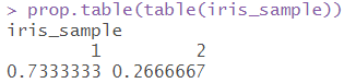 # 데이터셋 나누기 set.seed(1234) iris_sample <- sample(2,NROW(iris),replace=T,prob=c(0.67,0.33)) prop.table(table(iris_sample)) iris_training <- iris[iris_sample==1,1:4] iris_training_label <- iris[iris_sample==1,5]