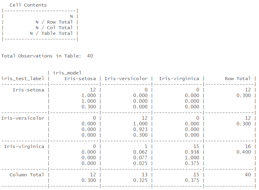 # 비교로 정확도 분석 library(gmodels) CrossTable(x=iris_test_label,y=iris_model, prop.chisq = F) |