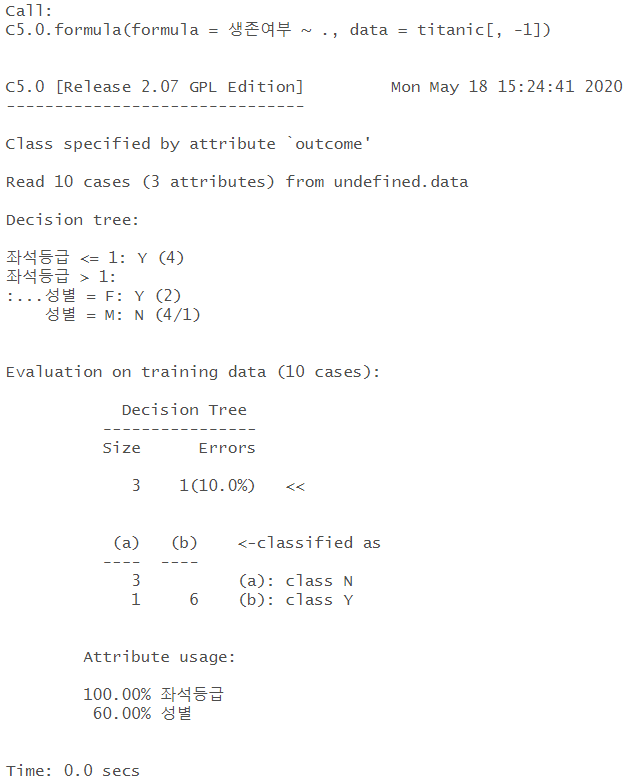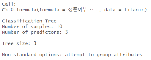 # 목표변수~., data = 사용컬럼 C5.0(생존여부~.,data=titanic) |