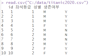 # 예측하기 : 한번도 경험하지 않은것도 분류 가능 test_data = data.frame("좌석등급"=3, "성별"="F") predict(object=model,newdata = test_data) |