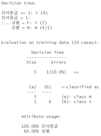 # 특정한 열만 사용 model <- C5.0(생존여부~좌석등급+성별,data=titanic[,-1]) summary(model) |