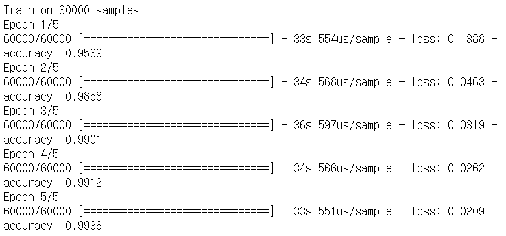 - 학습데이터 60,000개(확인용데이터 5000개), 테스트데이터 10,000개로 구성 되어 있다.
