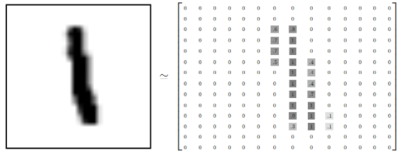 - 2차원 행렬에서 1차원으로 쭈욱 핀 형태로 784개의 열을 가진 1차원 행렬로 변환되어 저장이 되어 있다.