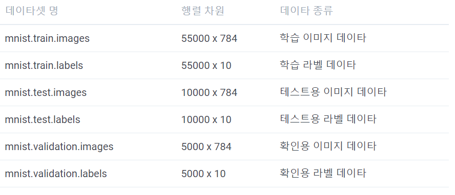 - mnist.train.image : 784개의 열로 구성된 이미지가 55000개가 저장이 되어 있다.