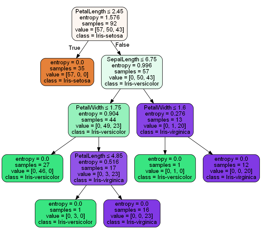 # 모델안에 몇번째거를 그릴 건지를 넣어야한다. estimator = model.estimators_[0] dot_data = export_graphviz(estimator, out_file=None, feature_names=x.columns, class_names=model.classes_, filled=True, rounded=True, special_characters=True) |