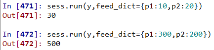 sess = tf.Session() sess.run(y,feed_dict={p1:10,p2:20}) sess.run(y,feed_dict={p1:300,p2:200}) sess.close() |