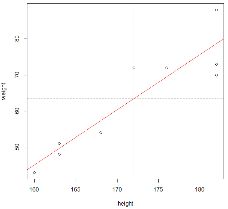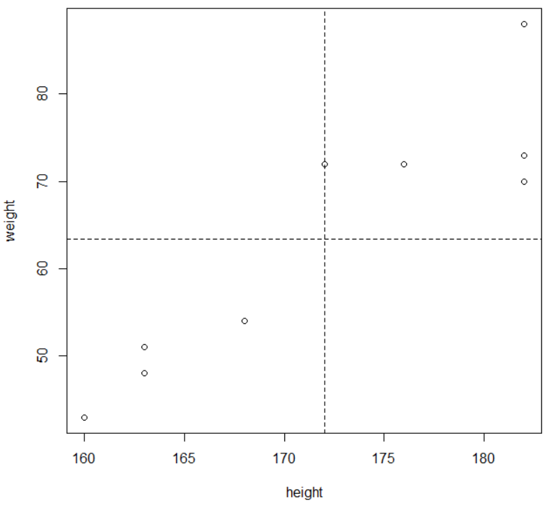 # 중심선 그리기 abline(h=mean(weight),lty=2) abline(v=mean(height),lty=2)