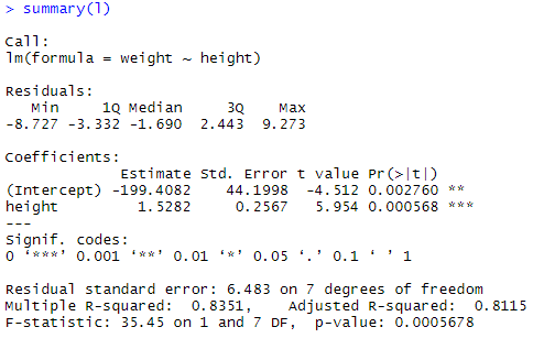 # 주로 봐야할 부분 (회귀모델을 채택할 기준) Std. Error : 표준오차 (기울기의 오류가 중요) Pr(>|t|) : 0.05보다 작으면 좋은모델 / 0.05보다 큰 모델 R-squared : 결정계수 |