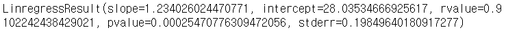 # 분석결과 확인 slope,intercept,rvalue,pvalue,stderr = stats.linregress(height, weight) |