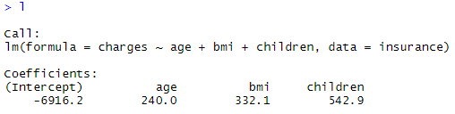 # 정규화작업을 하지않고 회귀식만들기 l <- lm(charges ~ age+bmi+children, data=insurance) |