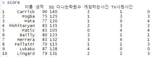 # 다중회귀식 만들기 lm(성적 ~ IQ+다니는학원수+게임하는시간+TV시청시간) |