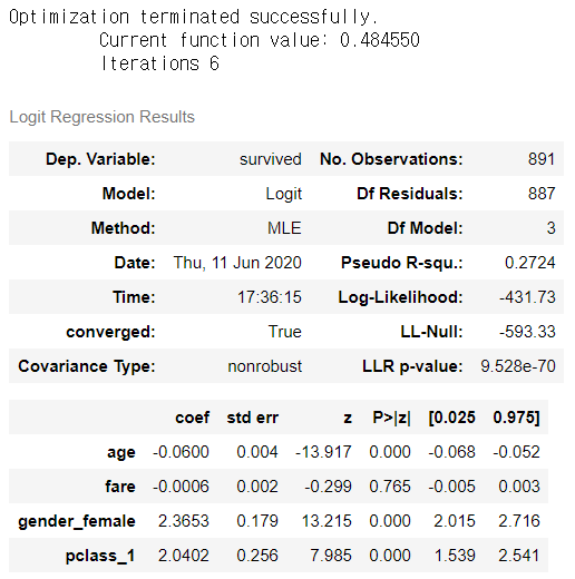 # 나이, 요금, 여성만 했을때 cols = ['survived','age','fare','gender_female'] y = data[cols] logit_y = sm.Logit(y['survived'],y.iloc[:,1:]) result_y = logit_y.fit() result_y.summary() |