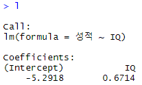 # 컬럼이름만 써도 되게 만들기(score$) attach(score) l <- lm(성적 ~ IQ) |