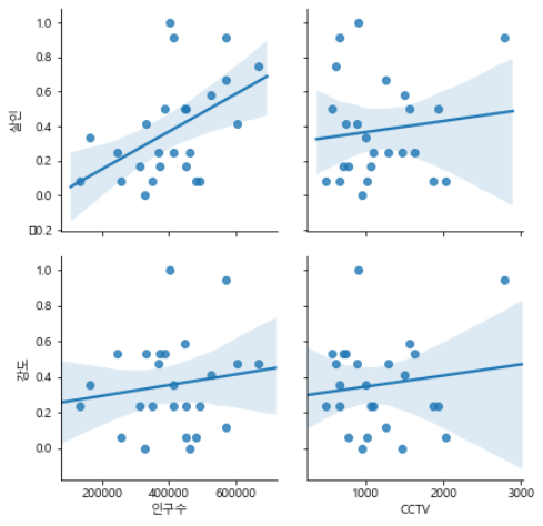# 인구수와 CCTV개수, 살인, 강도의 상관관계