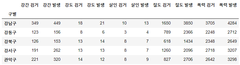 crime_anal_raw = pd.read_csv("C:/datascience_train/data/02. crime_in_Seoul_include_gu_name.csv", encoding='utf-8', index_col=0) crime_anal = pd.pivot_table(crime_anal_raw, index='구별', aggfunc=np.sum) crime_anal.head() |